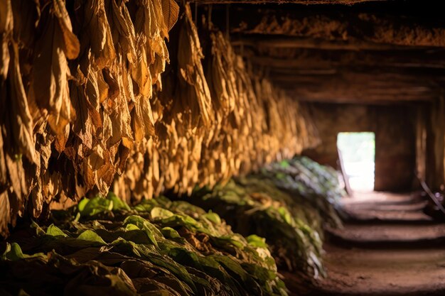 El Curado las hojas se cuelgan en graneros especiales durante hasta 12 semanas, perdiendo humedad y adquiriendo un característico tono marrón.